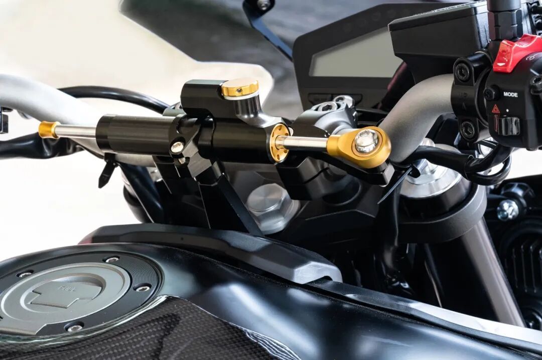 当然,现代摩托车科技也引入了装在车把上的转向阻尼器(钛尺),来解决死亡摇摆问题。当摩托车在高速下出现死亡摇摆时,车把试图剧烈、高速地左右狂甩,此时钛尺中的油液会因为特殊的设计立刻会产生巨大的液压阻力,像一把液压钳一样,死死“握住”车把,把疯狂摆动的能量转化成热量消耗掉。