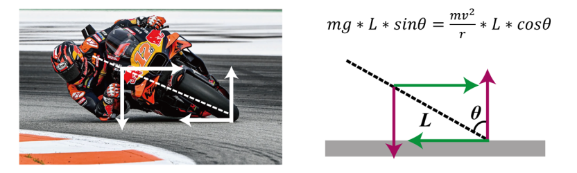 在车手的感官世界中,他仿佛在平衡两个力:实际上,以车作为参考系,车手的身体内挂,膝盖外探,是为了保持一个精妙的力矩平衡。